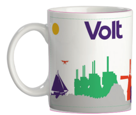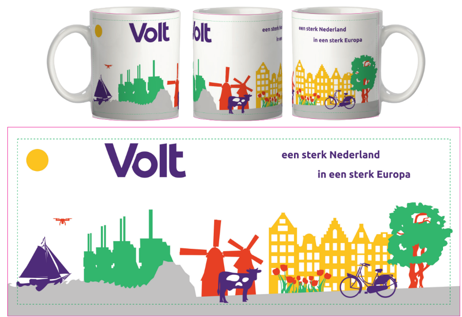Mug with Volt logo and Dutch icons and text “Een sterk Nederland in een sterk Europa”